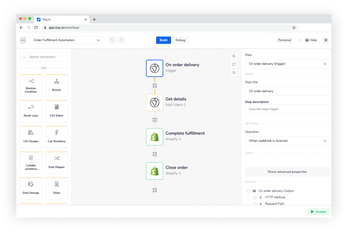 We want to notify our customers immediately after they’ve received their order. Let’s review this process in Tray: