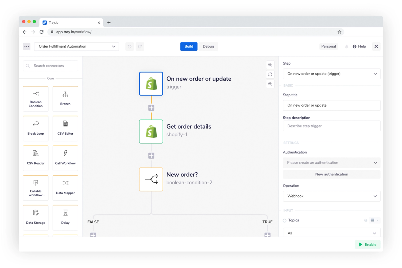 New order? - Next, we use a Boolean (true/false) helper to evaluate the order’s status to determine if this order is new or updated. Depending on the result, we route our workflow into one of two outcomes: