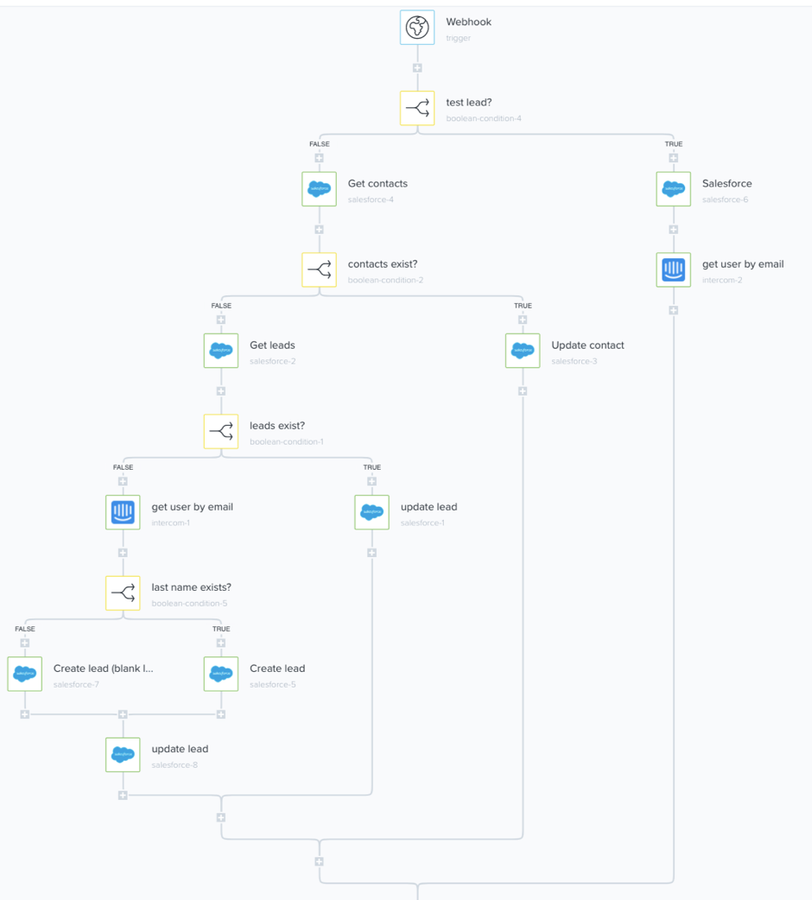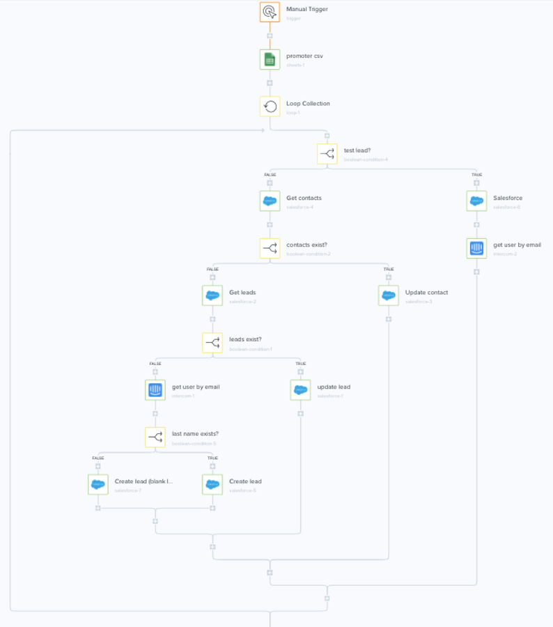 In this step, Boolean-condition-5, we're using our old friend the boolean connector to determine if the last name in Promoter.io exists in the Salesforce lead object and then if we don't have the last name to go and get it out of Intercom, and if we do, create the lead by adding the email, first name, last name, and company name.