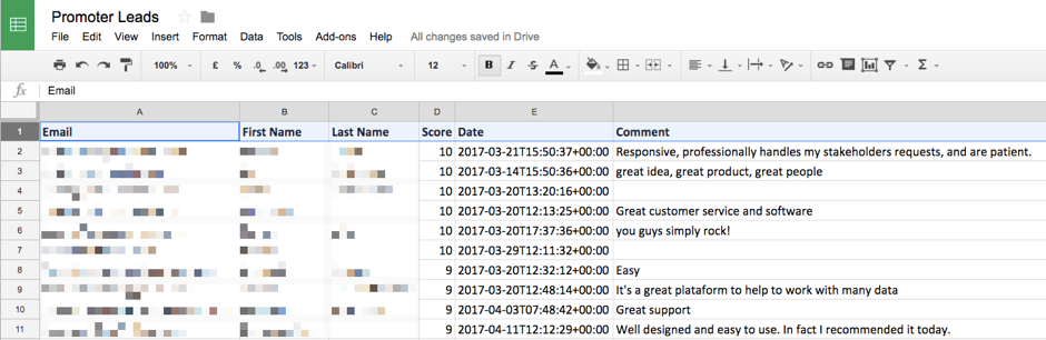 One of the fastest ways to get historical data in is to export it out of your customer survey tool to a CSV, then copy and paste the data into Google Sheets. You’ll notice in the screenshot that I only needed six fields.