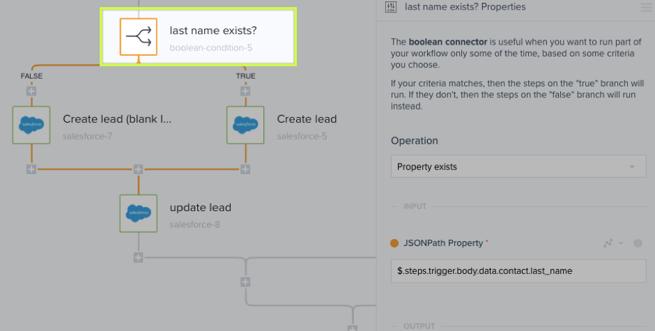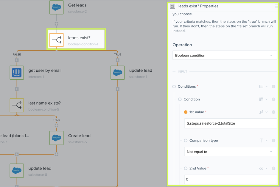 Similar to the "Contacts Exist" step, this boolean-condition-1 step checks to see that the lead exists in Salesforce. By using a boolean to see if the lead is not equal to zero (it exists), then go to the TRUE side of the branch to and execute the next step which is to Update the Lead (salesforce-1). If the lead equals zero (doesn't exist), then go to the FALSE side of the branch and execute the next step.