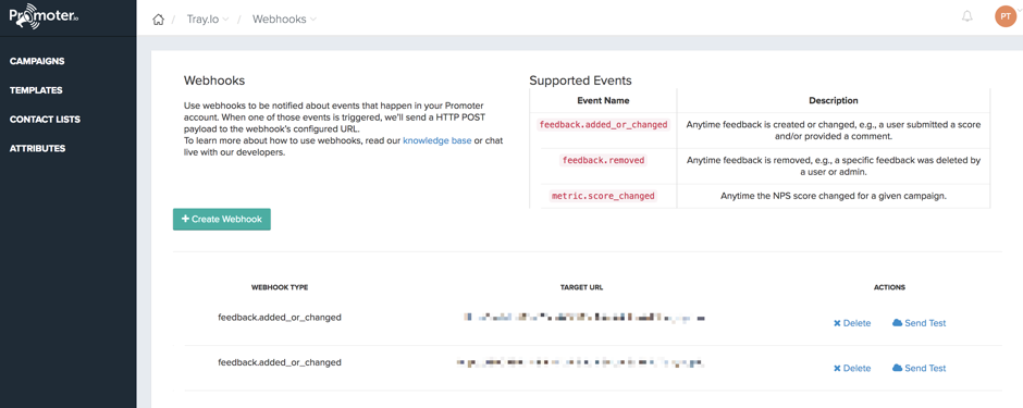 Our Promoter.io webhook details the Supported Events (e.g., changes in fields) and the target URL (pixelated out in this screenshot for privacy reasons).