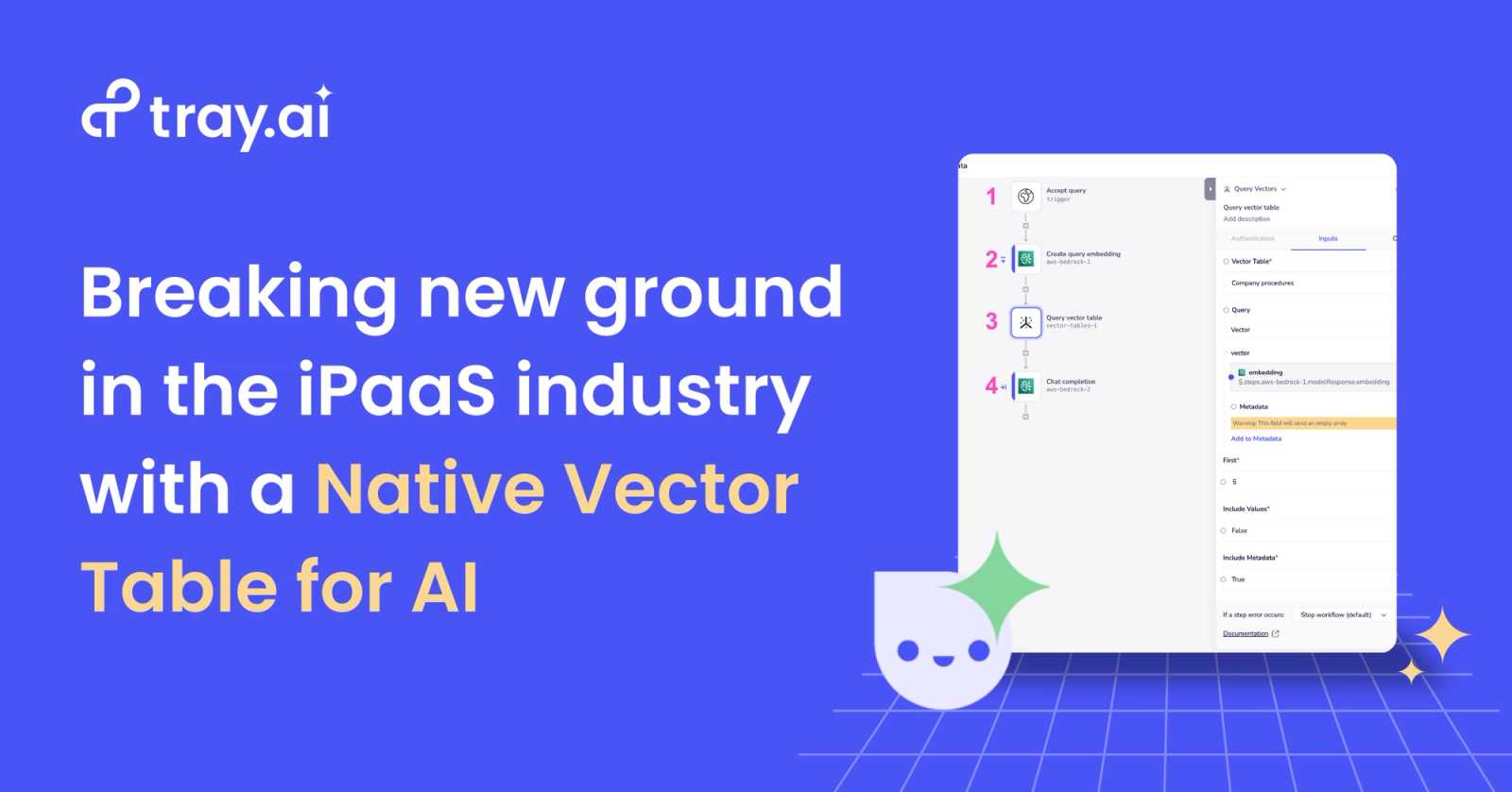 We are excited to announce the first native vector table built within our AI-ready Integration Platform as a Service (iPaaS). Our native vector table allows application development teams to quickly access AI's full power and possibilities without needing third-party integrations. Users can now store, manage, and utilize vector embeddings directly within the platform, enhancing AI-driven workflows and enabling more sophisticated data processing and retrieval operations. With these new capabilities, we remove a significant roadblock in the development of AI, allowing you to ground your AI applications in your data.