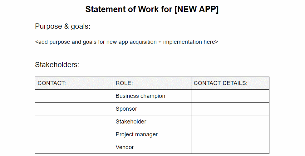 - Identify key stakeholders - Once you have a fully scoped-out plan to acquire your next piece of software, it’s a good idea to immediately identify everyone who will be involved in the process and begin clearly communicating expectations and timeframes. Stakeholder involvement might include, but not be limited to, consulting on product usage scope, actively participating in the evaluation process, or actively participating in enablement. Some larger organizations utilize a cross-functional product council