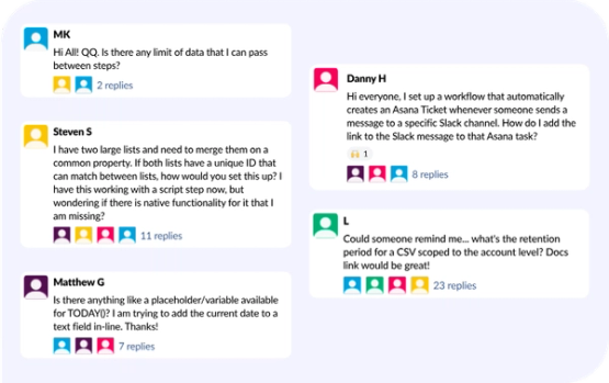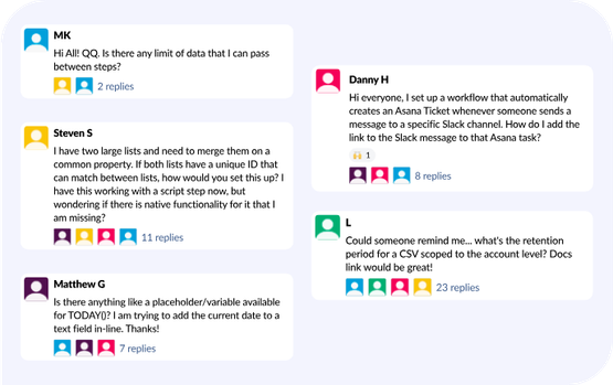 Work and communicate with peers and experts, directly in Slack. Grow alongside our engaged community members and be the first to know about product updates - directly from the product team at Tray.ai.