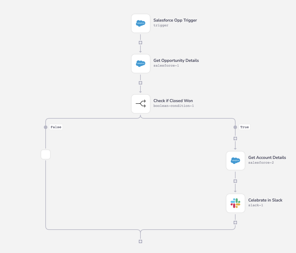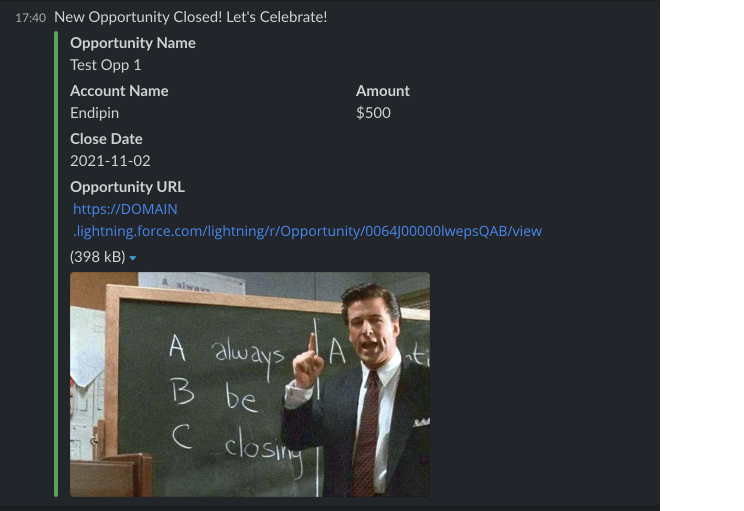 This template takes Salesforce opportunities that are marked "Closed Won", and shares a message on a Slack channel with the opportunity details. It can even send an image or emoji alongside to create emphasis. The Salesforce trigger is fired every time an opportunity is updated. If the change that fired the trigger was updating the stage name to "Closed won", then that change will alert the relevant Slack channel with said update.