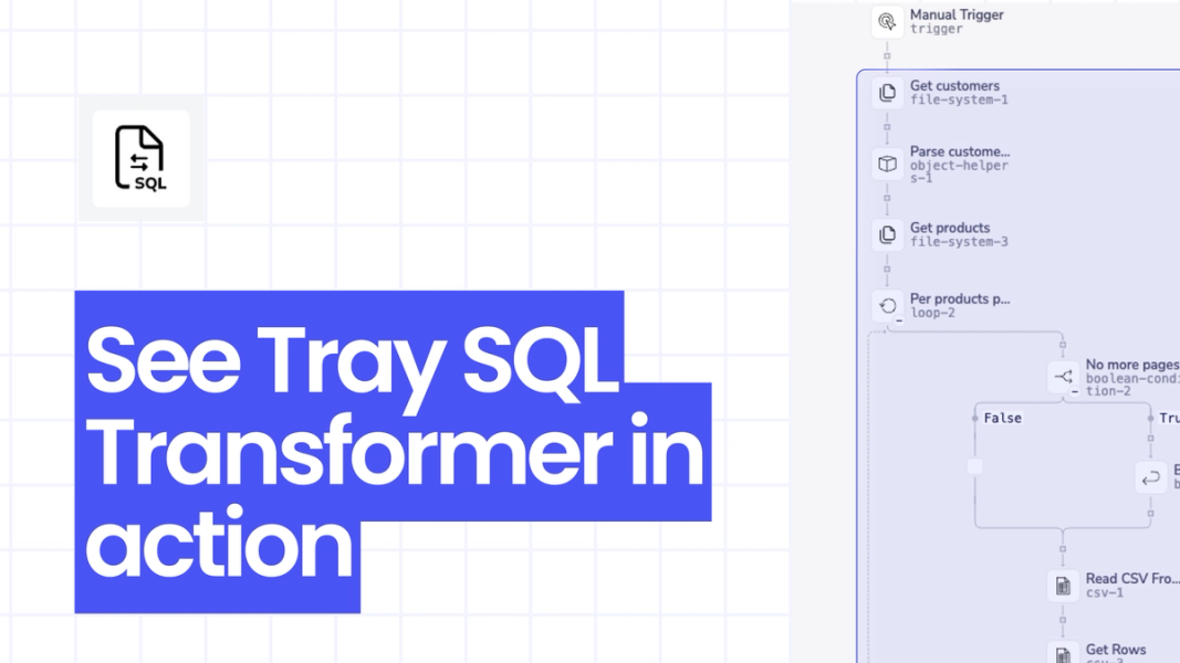 Power data pipelines with the Tray SQL Transformer that processes data in a single database operation instead of row-by-row iteration.