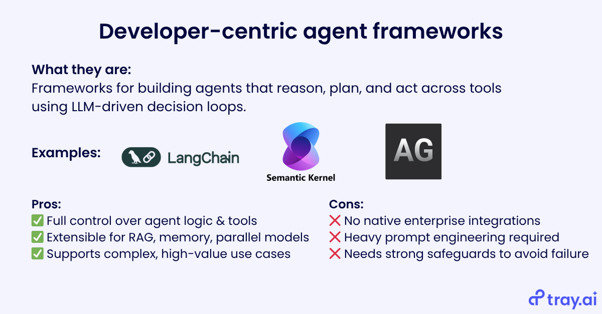 Developer frameworks are powerful but require experienced teams to use effectively. They’re best for pushing the limits of agent capabilities when you have the technical resources to support them long term.