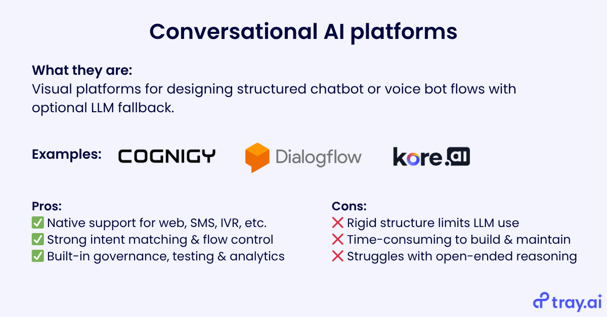 Conversational AI platforms like Dialogflow CX, Kore.ai, and Cognigy are built for managing structured interactions, usually in the form of chatbots or voice bots. They give you a visual interface to define intents, handle user input, and guide conversations step by step through predefined flows.