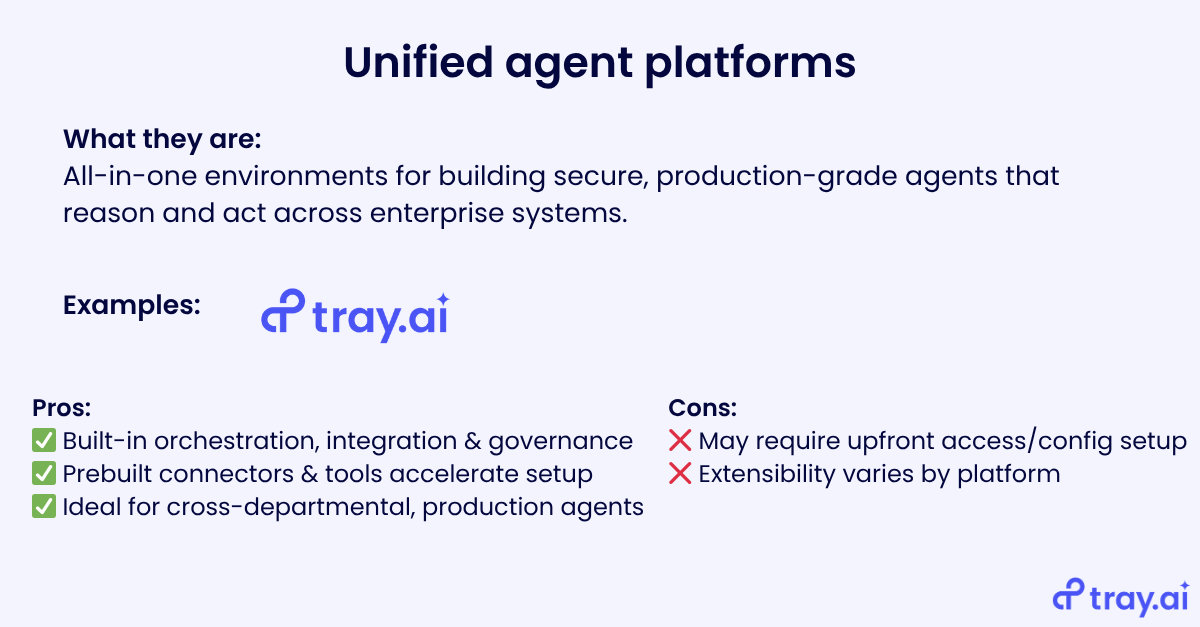 Unlike wrappers or frameworks, unified platforms include built-in access controls, audit logging, API authentication, and permission-aware execution. Many also include an iPaaS layer for deep integration, ensuring AI agents can act on real enterprise data without brittle, one-off connectors.