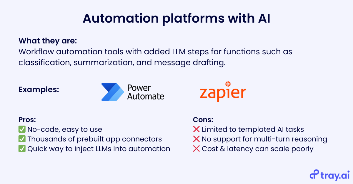 Now, these platforms are adding LLM steps into the mix. You can insert an AI action to summarize a support ticket, classify an email, or draft a message. In some cases, you can even build full workflows using natural language prompts.