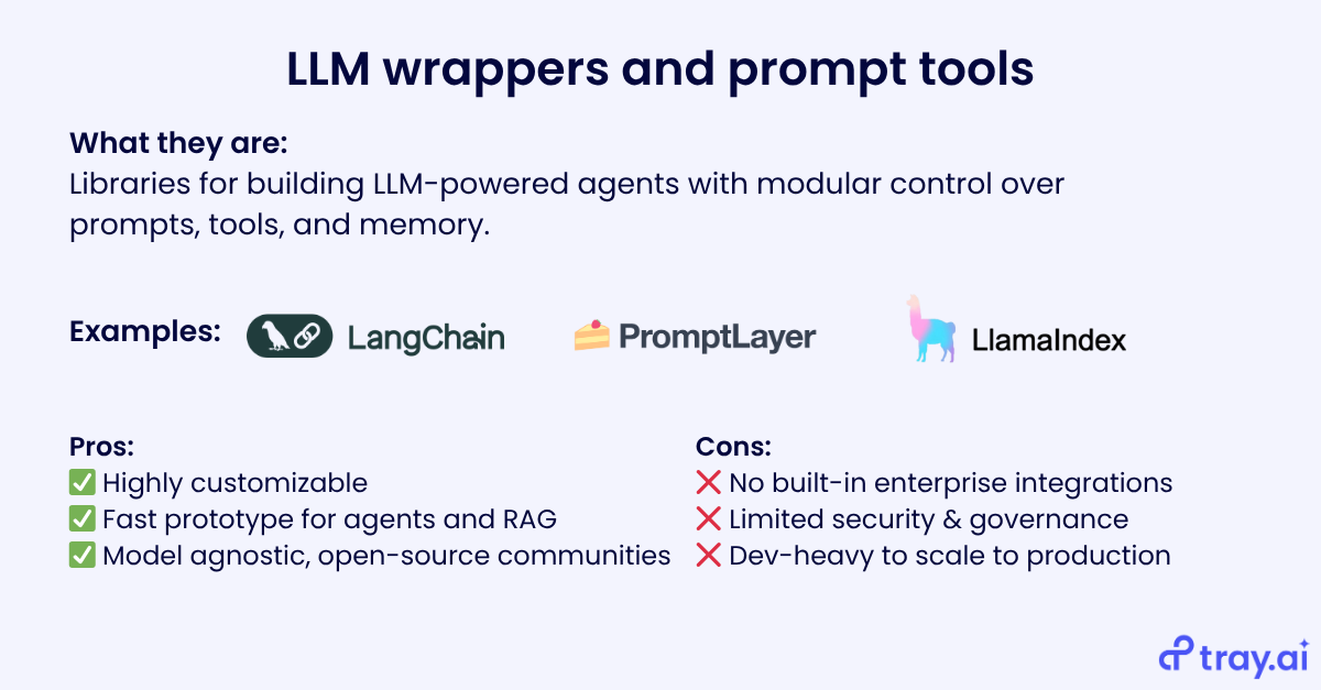 LLM wrappers are useful if you’re exploring agent behavior or need to experiment across multiple models. But in production settings, especially those involving enterprise data and systems, they often need to be paired with additional infrastructure for integration, orchestration, and compliance.