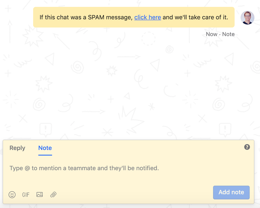 After we determine the status of our message, our process places the spam check as a private note on the conversation in Intercom. This gives the sales team a one-click option to quickly mark the conversation as spam and close it at the same time.