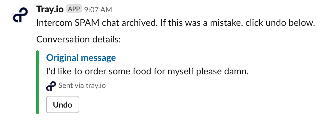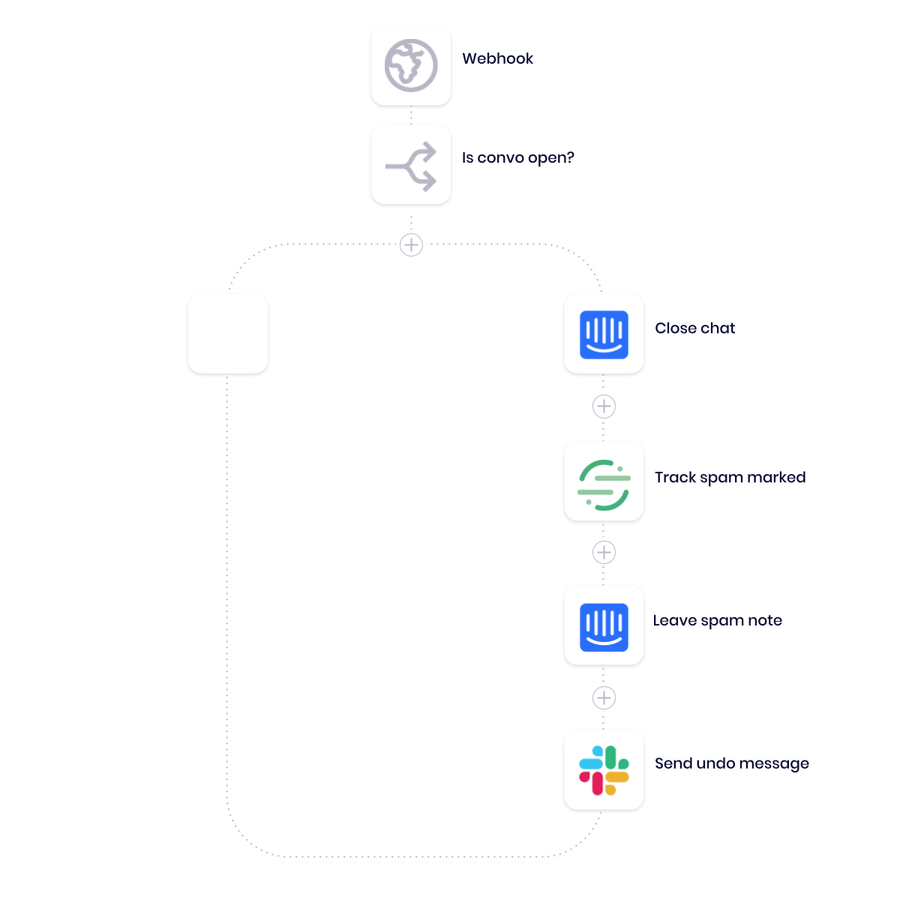 - Marking conversations as spam - The second part of our process flags any obvious spam messages as such, closes that chat conversation in Intercom, and alerts the conversation owner.