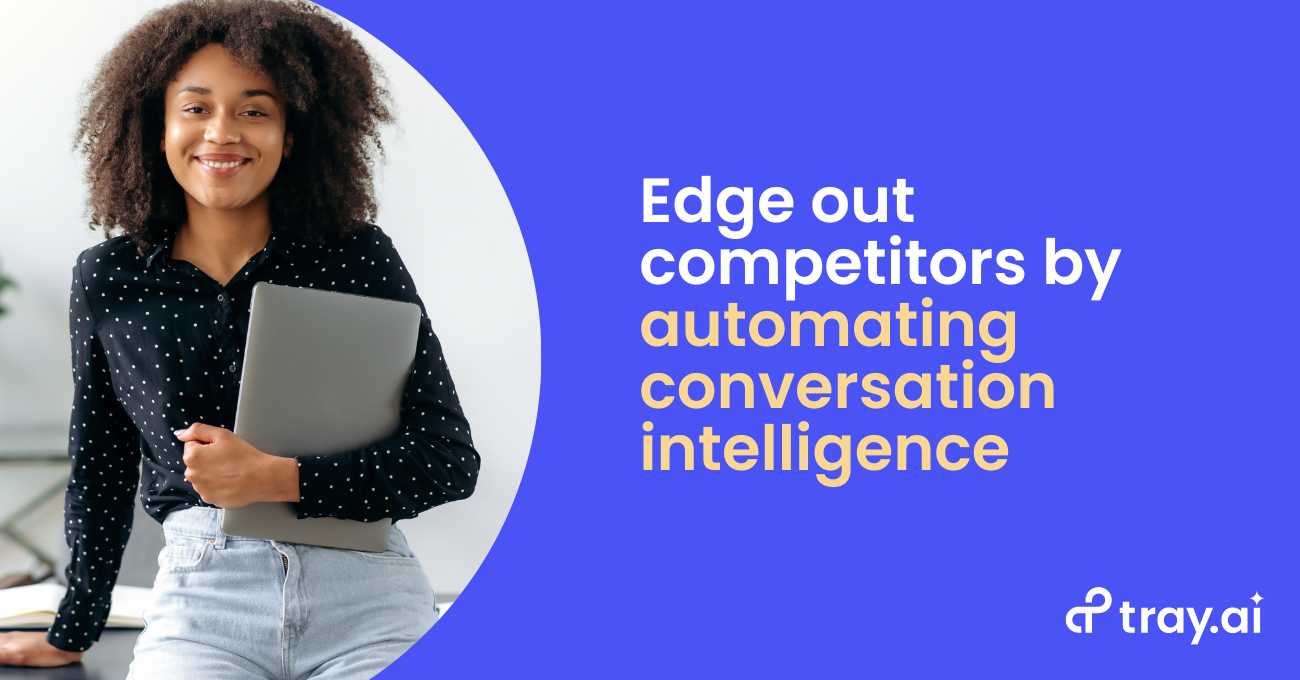 This post will break down a workflow that notifies sales teams when a competitor is mentioned in a sales call, providing them with the information needed to act quickly and better prepare for future calls. For this workflow, we’ll be using an AI-ready iPaaS, Tray. Tray uses API integrations tp directly connect different apps, along with API-level automation to trigger a series of automated steps to flow data between those apps. As we’ll see in this example, Tray is flexible and powerful enough to rapidly convert a competitor mention on a sales call into actionable insights to help sales teams win more deals.
