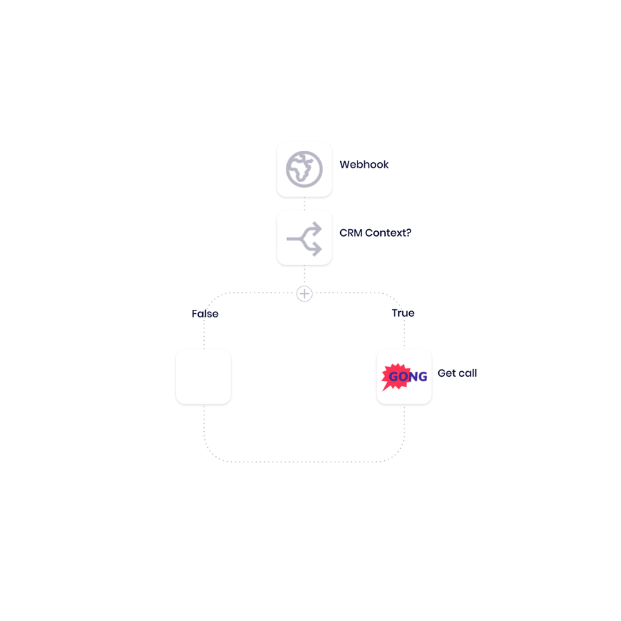 That’s why we included our first Boolean statement of the workflow, which ensures that we are only tracking sales calls with CRM context tied to the call data. We’re able to seamlessly implement this step by calling on the data supplied from our webhook and checking to see if it contains any CRM context in the output. If our boolean returns “true”, we access Gong via our connector and retrieve pertinent data within the call.