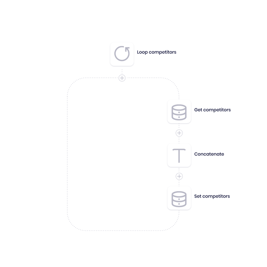 Once the workflow retrieves information from our call, it creates a new list to store the competitor names mentioned in the sales call using our list helper. Since some of our calls might include multiple competitor mentions, we used a loop to populate each unique competitor in a new row of the list. With each pass of the loop, the workflow: