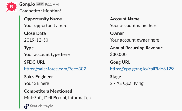 While this workflow goes through many steps, in practice, it delivers these essential competitive insights immediately after Gong records a sales call to the team members that need it the most.