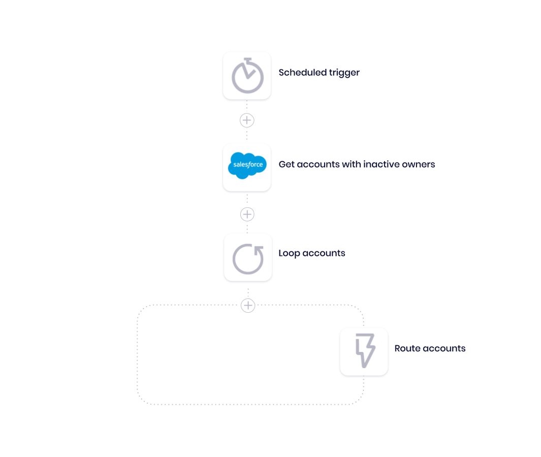 Between promotions, turnover, and transfers, sales teams are constantly evolving. The fluid nature of the profession can make it especially hard to maintain reliable records when account owners change hands. Instead of manual routing and handoffs, we can use automation to transfer ‘ownerless’ accounts to active users seamlessly.