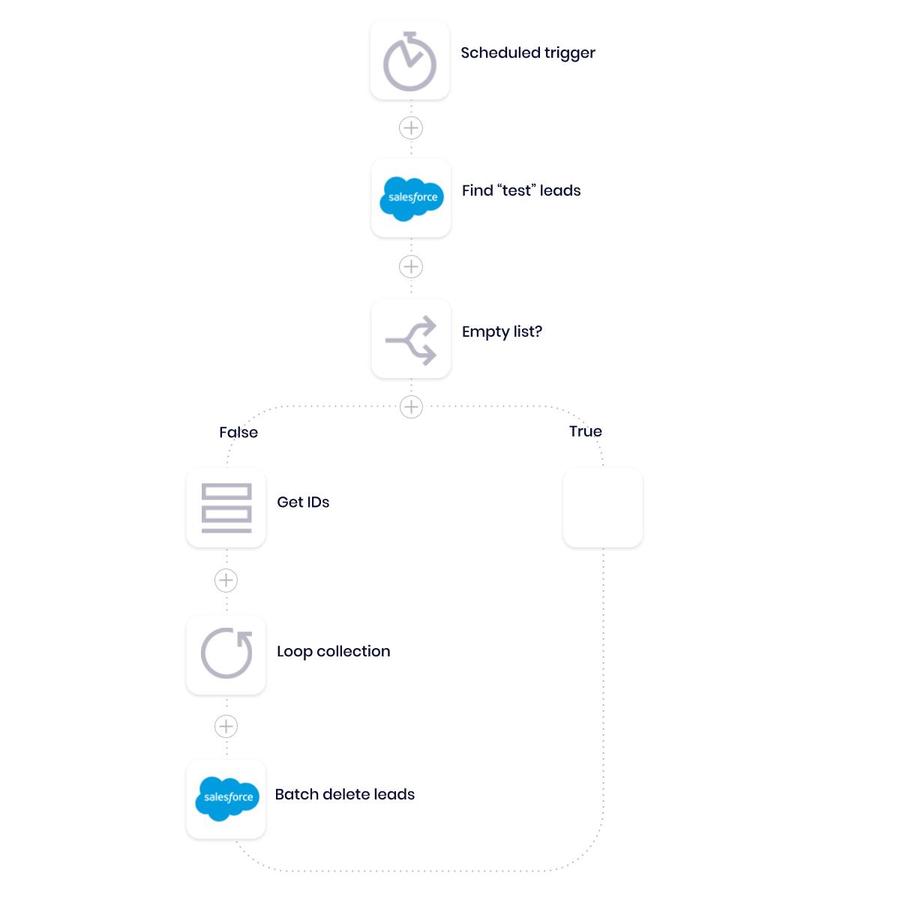 Batch delete leads- Once we have found at least one dummy record in our previous search, we use additional logic to format and parse our list. Then, we delete all applicable records in Salesforce in bulk. Within moments, we’ve auto-purged all dummy lead records from our CRM so that our sales team can focus on real leads that have a chance of becoming active opportunities.