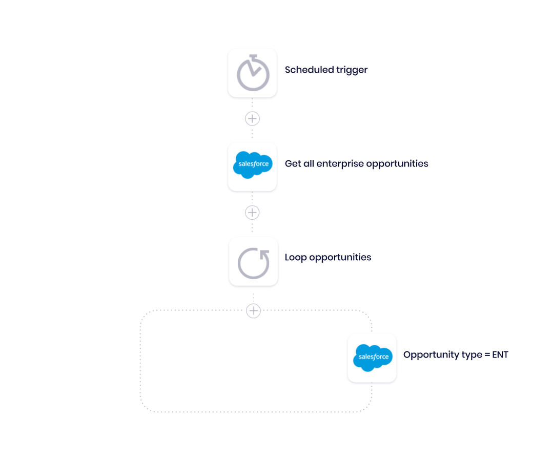 Get opportunities- Here, we pull up all opportunities in our CRM of a certain type. In this case, we’re looking for pulling all enterprise opportunities, although we could easily customize the process to target virtually any record or type.