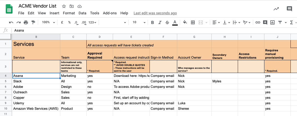 Before building out an automated request and provisioning process, we’ll first want to audit the services and vendors that our organization currently uses. With this information, we can create a centralized spreadsheet that includes details such as vendor name, whether the tool needs approval, installation instructions, and service owner. We’ll need this documentation to process and route requests later on in our approvals process.