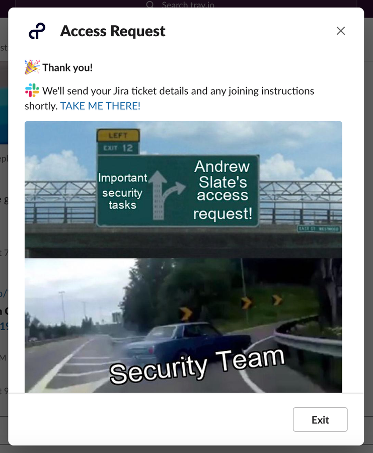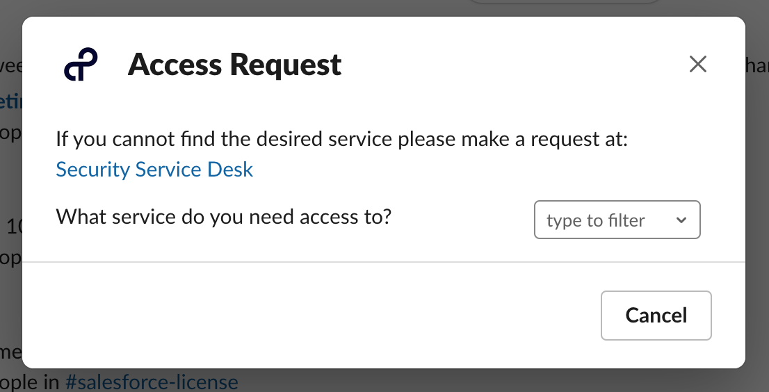 - Processing requests - When a teammate engages with the access request modal (i.e. interface) in Slack, we capture that data and ensure that we route it to the right place.