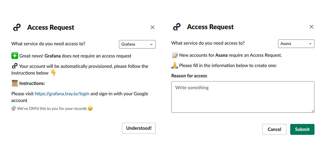 Since each tool has different access and provisioning requirements, we built out additional logic that updates the request modal with more context if needed.