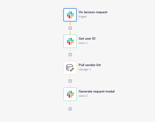 Our workflow begins with a Slack trigger, which listens for the ‘/access-request’ slash command. When someone in our workspace uses ‘/access-request’, the workflow will get the user’s ID, pull our list of vendors from our data storage helper, and use that information to surface a request modal. In the request modal, the end-user can select a specific service from a dropdown menu.
