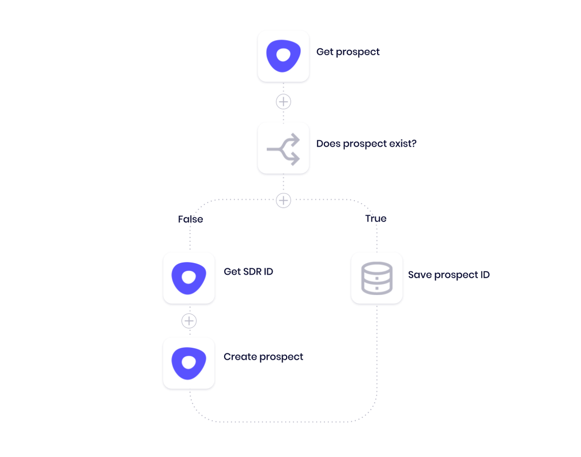 Does prospect exist? - We then use a Boolean to determine if our prospect already exists in our sales engagement software. Depending on the result, the Boolean routes our data to one of two outcomes: