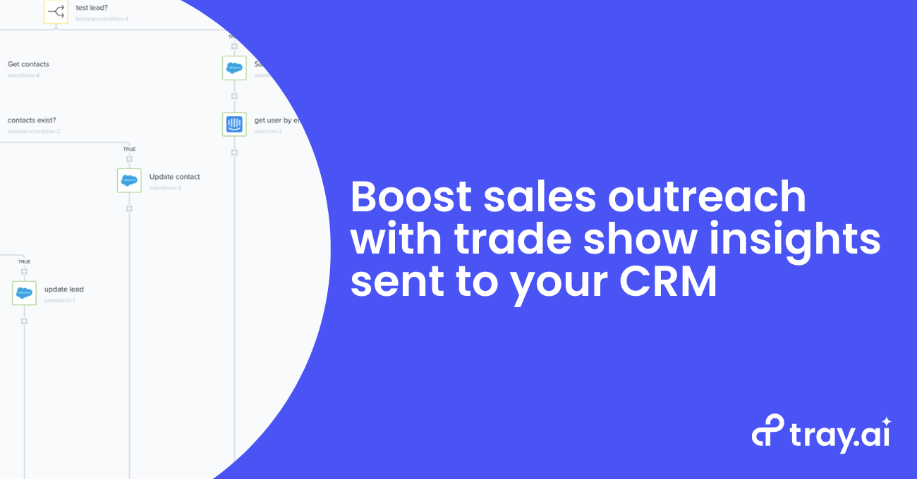 Using the power of iPaaS, your revenue operations team can easily create an automated workflow that uploads insights from trade shows into your CRM. Modern iPaaS like Tray combine the ability to seamlessly integrate any apps in your revenue stack at the API level with the ability to orchestrate multi-step processes across your CRM and other apps - all with an easy-to-use, drag-and-drop interface.