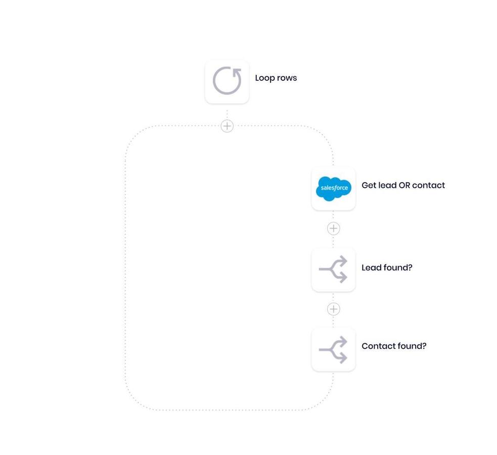 • Match record in Salesforce - Here we take each of the emails supplied in our sheet and confirm that it matches with a record in our CRM. In this case, we use our Salesforce connector to make the association.