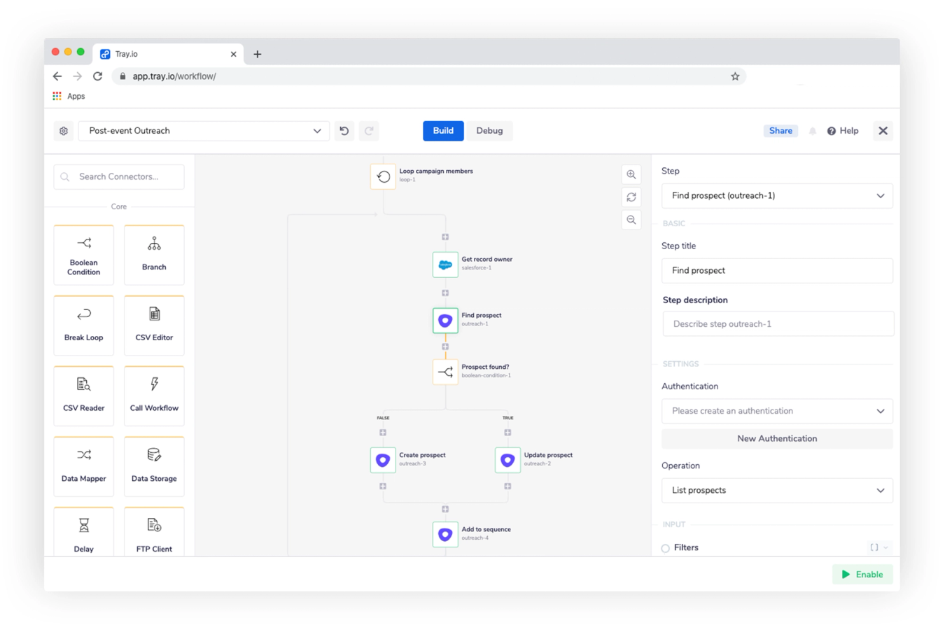 - Loop leads and add/update prospects - Here, we’ll verify lead data by looping through each record and check it against our sales engagement platform, Outreach. If a prospect already exists, we update the record. If not, we add a new one. We’ll also add the record to a predetermined sequence.