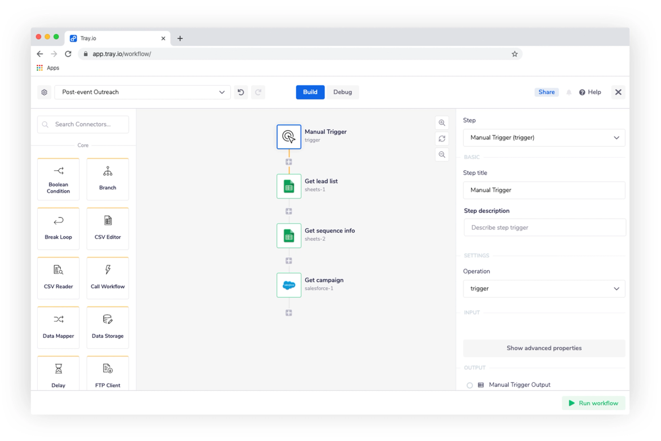- Parse spreadsheet and match campaign - After a trade show, your team likely has a spreadsheet containing all the details from any leads it captured at the event. So first, we use a manual trigger to kick off our workflow any time we return from a trade show. Then, we parse the spreadsheet in Google Sheet format to determine the sequence ID and other context about our leads. We’ll also call our CRM, Salesforce, in this step to get a list of leads that match the campaign ID.