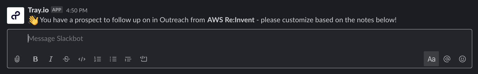 After syncing our lead list with the data in our sales engagement platform, we’ll want to send confirmation messages to the owners associated with each lead to share any notes from the trade show and remind them to follow up.
