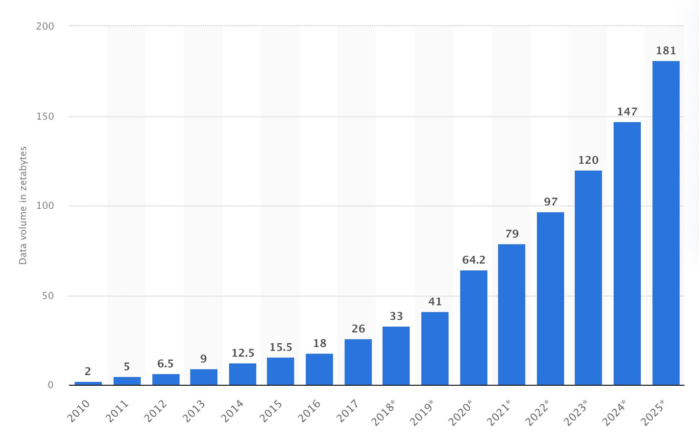 Estimates suggest 2025 will produce more than 180 trillion gigabytes of data. Image courtesy Statista.
