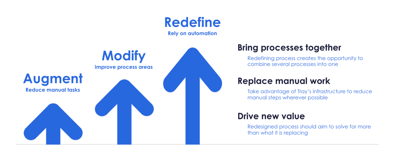 As teams become automation experts with iPaaS, they can free up time lost to process overhead and focus on improving their overall output via process redefinition. You can think about process redefinition through the augment-modify-redefine model. We derive our model from a framework developed by education researcher Ruben Puentedura to describe technology integration. Through this framework, we can easily categorize solutions into one of three groups: solutions that augment work, modify it, or redefine the work altogether.