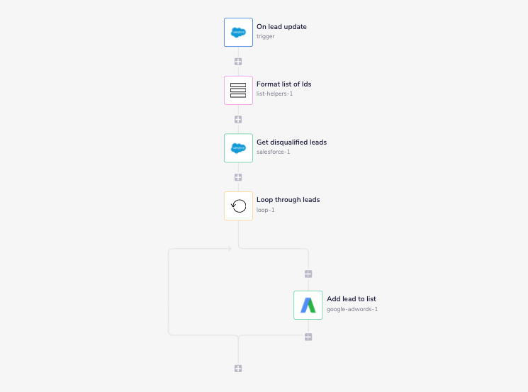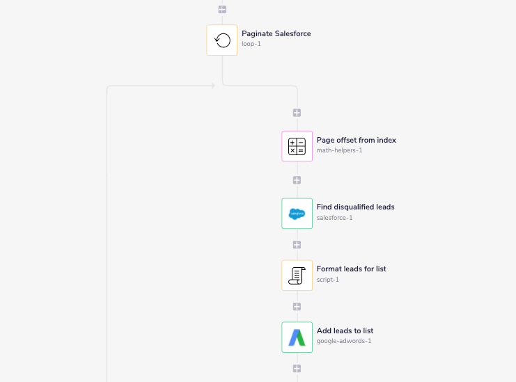 - Batch-creating exclusion lists - This stage creates a new list in our ad platform (Google Ads), checks existing records in our CRM (Salesforce), and individually adds leads to the list.