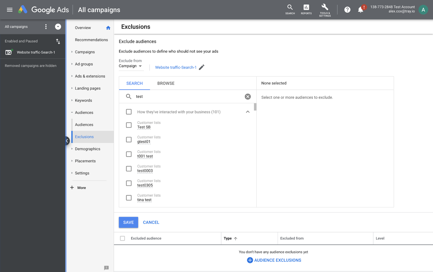 Once we’ve created the list in our ad platform, we need to assign it to a campaign as an exclusion list. We can create new exclusion criteria in Google Ads by going to audiences > exclusions in the campaign view, creating a new audience exclusion, and selecting the list we created.