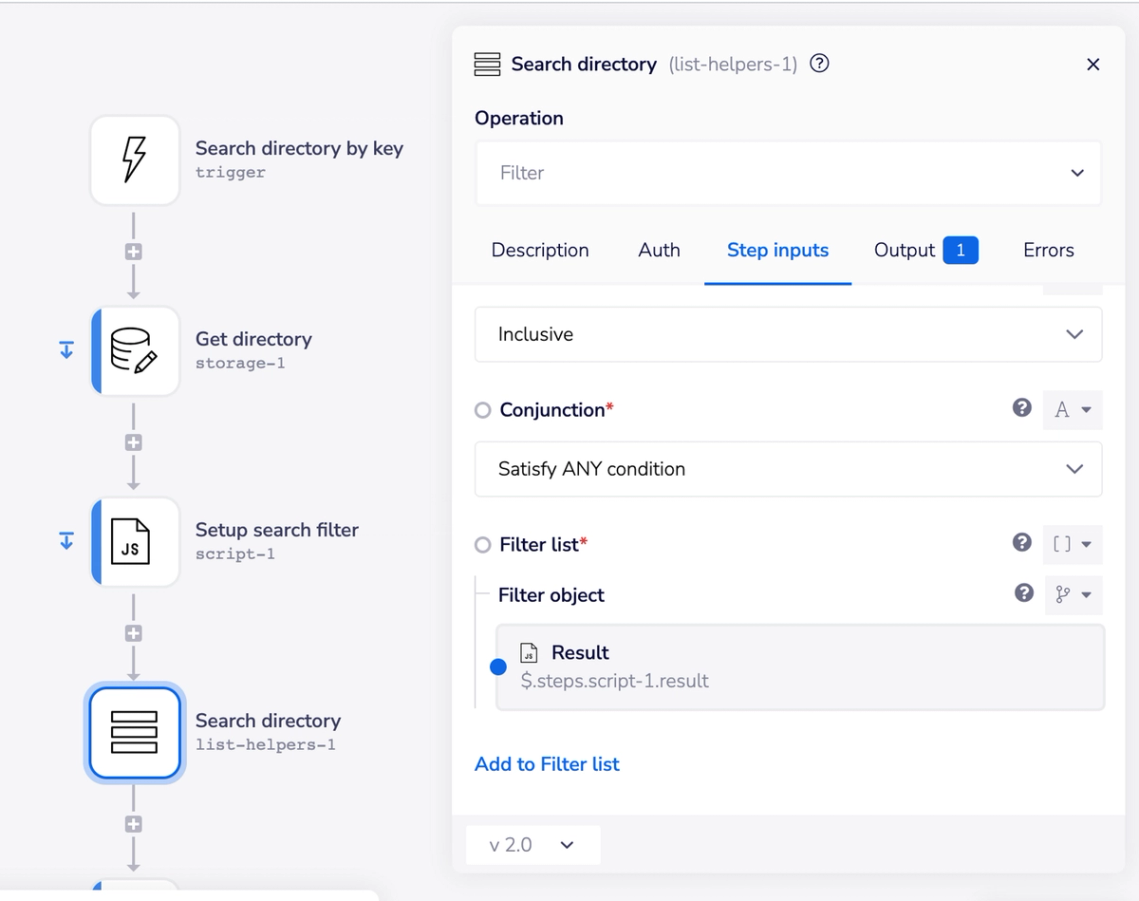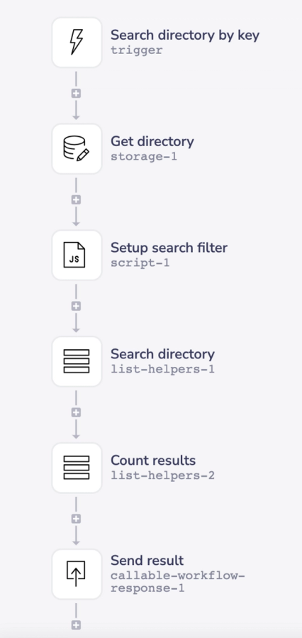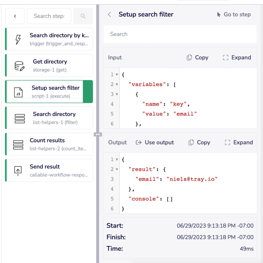 The entries are stored in a lookup table using the data storage connector. The directory callable has is a pretty simple workflow design which first grabs the directory from the “account” scope of data storage, then uses the search key and search value from the trigger inputs to form a filter object: