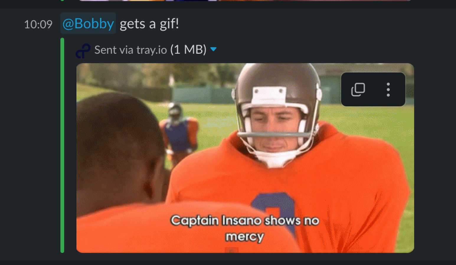- It’s Fun: We have a cool feature with our directory where we allow Salesforce users to store a custom GIF link on their user profile. We store that on their directory entry and use it to send a congrats to them, like when they close a deal: