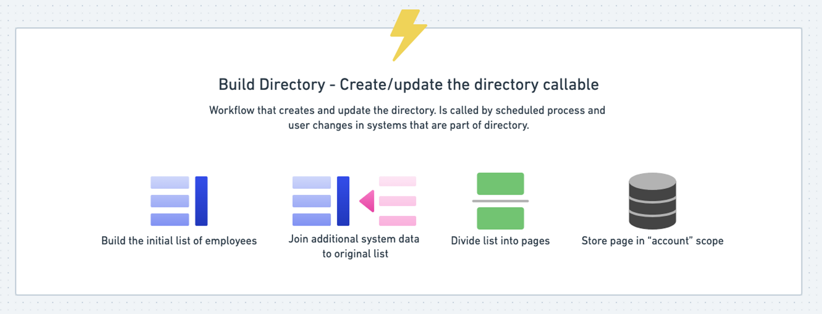 We turn this process itself into a “fire and forget” callable whose function is to “rebuild the directory” whenever we need. This allows us to have a schedule trigger which rebuilds it nightly, but also system-specific triggers that fire in real-time whenever a user is added or removed from the system so we can instantly rebuild the directory and make those updates as soon as they occur.