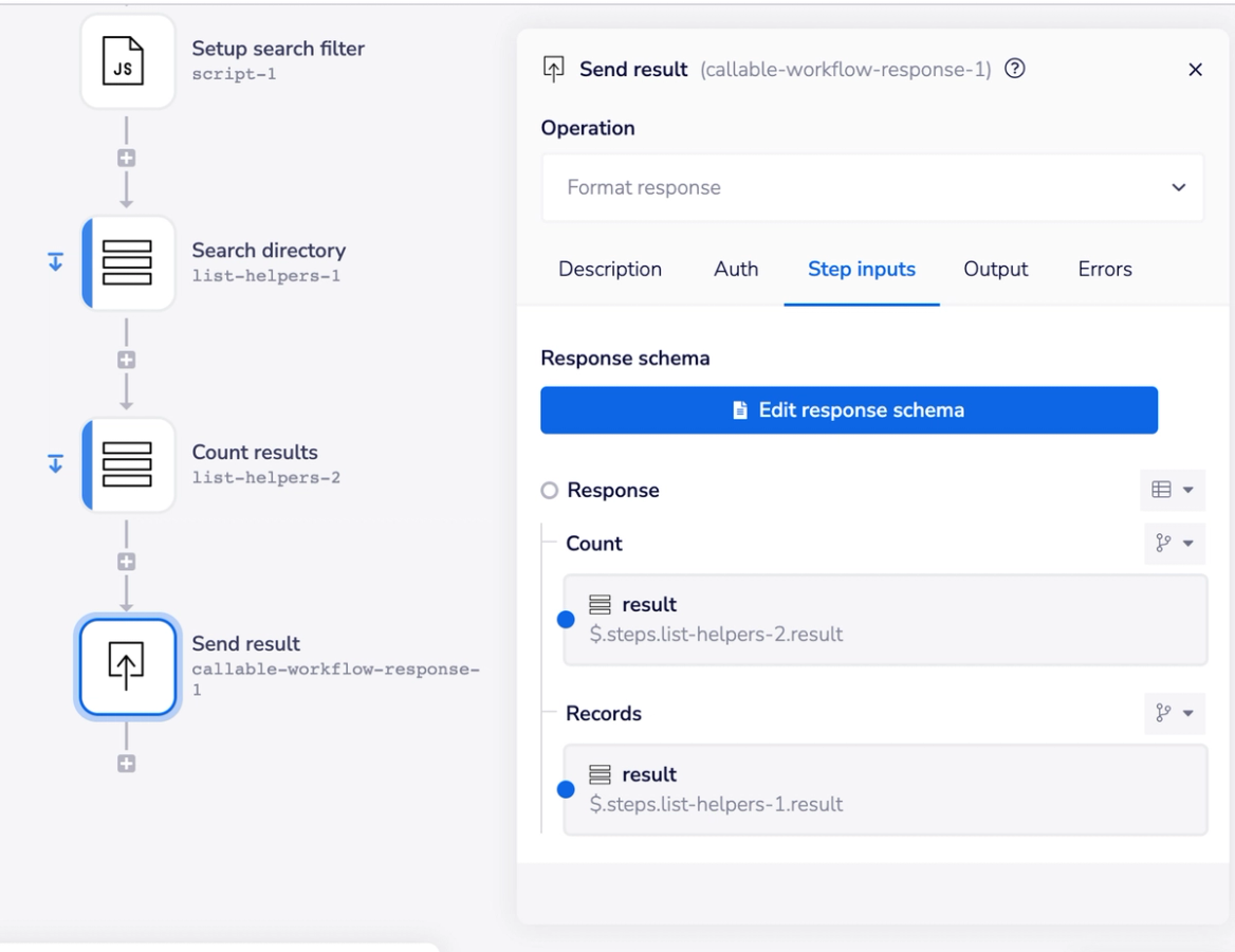 A count of the number of matching results is done using the results from the filter step and it’s all sent back to the workflow that called: