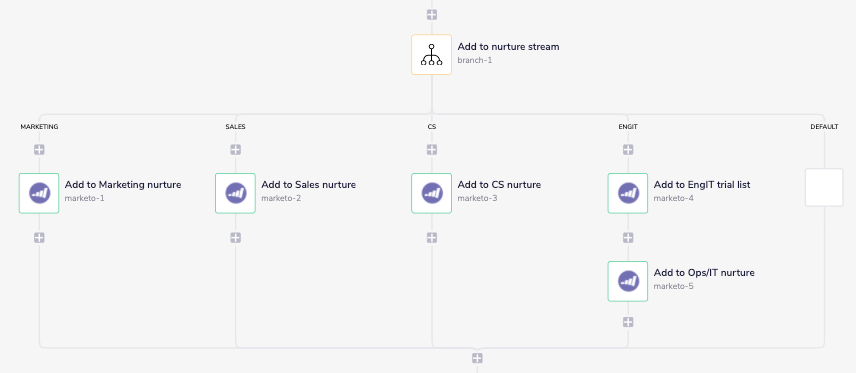 Here at Tray.ai, we’re in the business of unlocking the potential of our customers’ tech stacks. As such, we serve a variety of different personas, including professionals in sales, marketing, revenue, and support, among other roles. Since we cater to many different audiences, we nudge our prospects into distinct nurture streams that deliver unique content based on their job function. Obviously, your company may target different personas in different roles, and thankfully, our low-code platform is flexible enough to let you go after the specific personas you need.