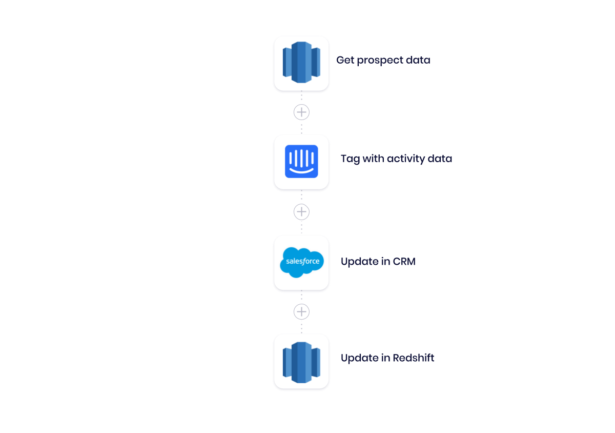 Here, we pull data from Redshift and through our web chat service, Intercom, to tag prospects as ‘active’ or ‘inactive’. Then, we update our records in both our CRM and our data warehouse.