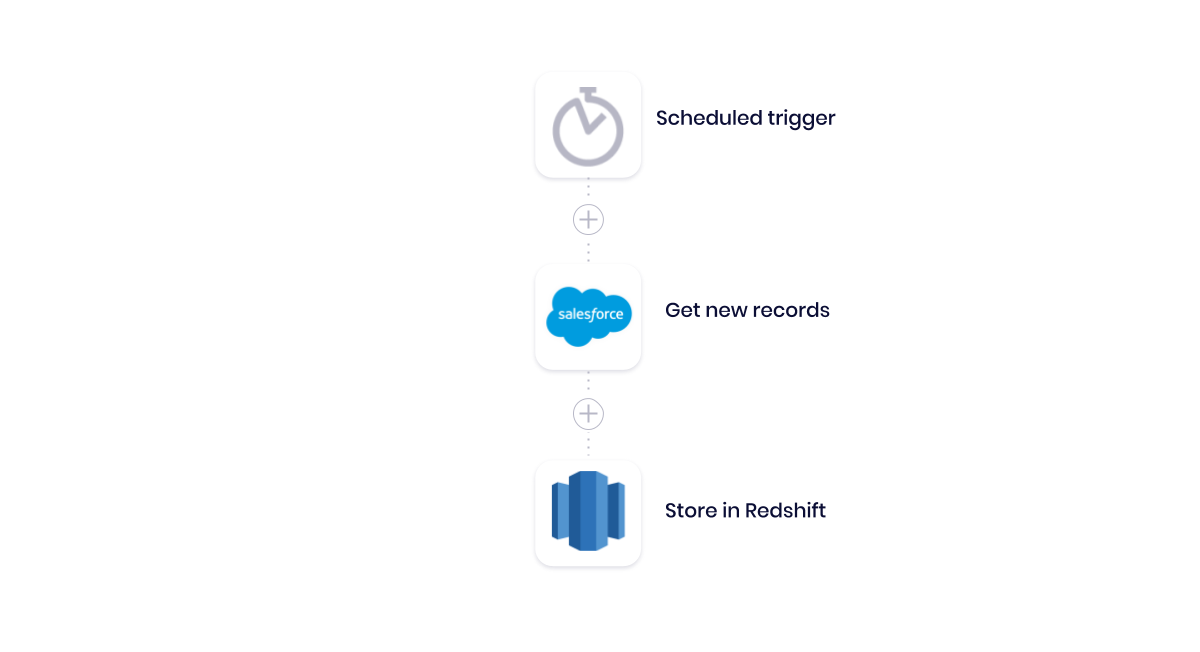 In this workflow, we start with a scheduled trigger to ensure our workflow runs every day. Next, we call on our CRM, Salesforce, to get a list of records that we added in the previous period. Then, we sync those records with Redshift to refresh our dataset.