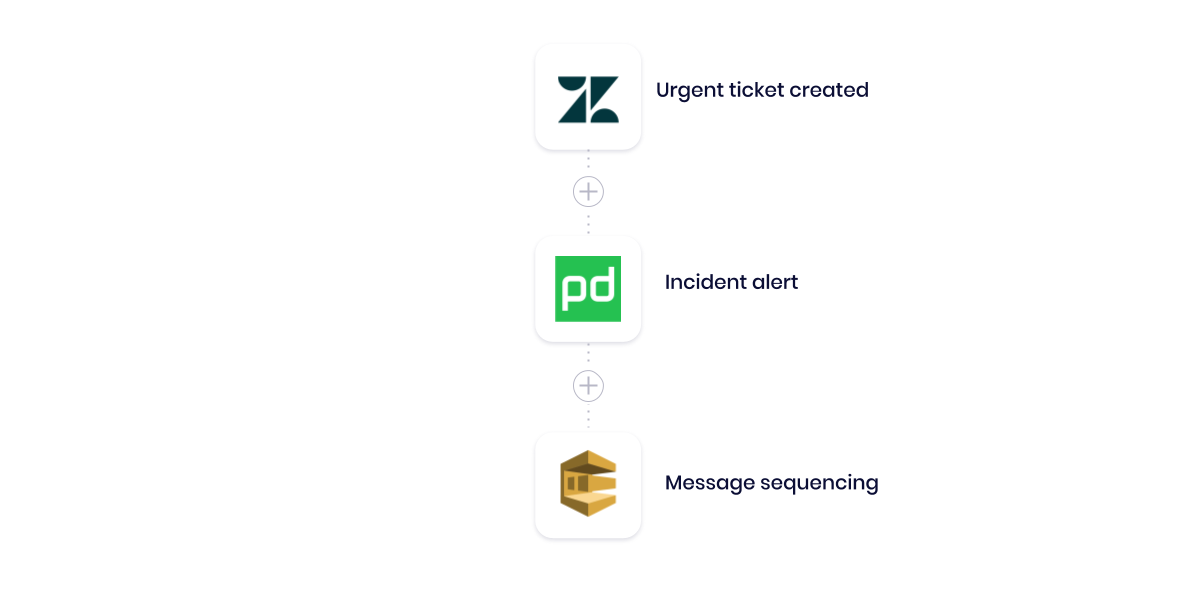 Our workflow calls on our helpdesk (Zendesk) to trigger whenever a support agent logs a new issue. The workflow then routes urgent tickets to our incident management software (PagerDuty), which sends SMS messages to on-duty field agents. The workflow then uses SQS to rate-limit messages to ensure that all messages get through, without potentially being throttled or flagged as spam by a mobile provider in case of volume spikes in reported issues.