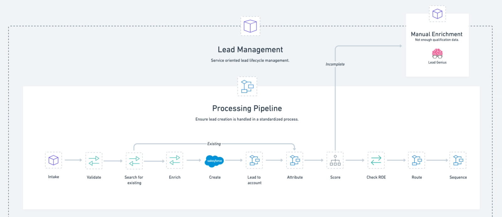 At the center of this framework is a workflow we call the “Lead processing pipeline”. The pipeline is responsible for orchestrating each of the essential lead management jobs to be done. From intake to creation to enrichment and beyond, you can use this process for any lead, no matter the source.