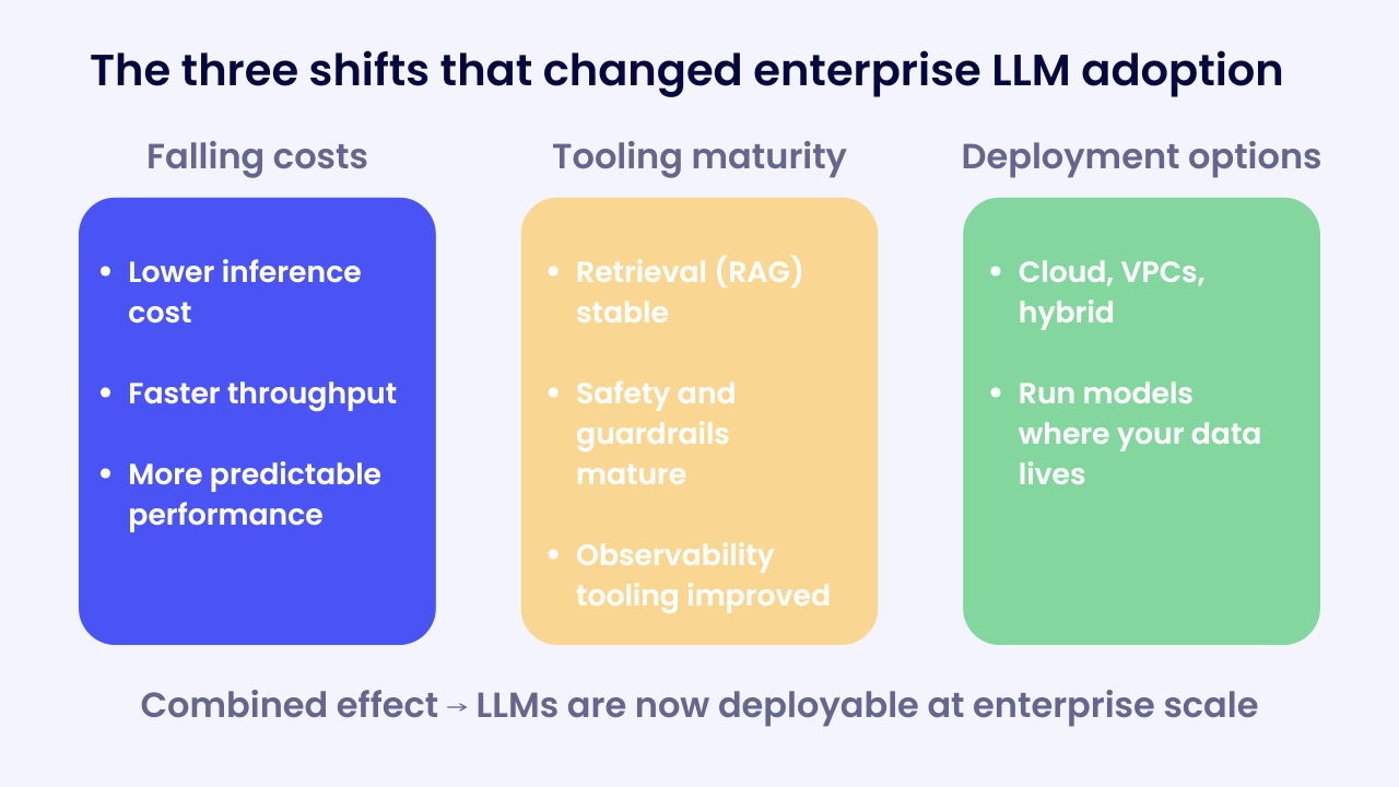 You can point to three shifts that changed the equation: falling inference costs for many tasks, a surge of tooling maturity around retrieval, safety, and observability, and broader deployment options across clouds and VPCs (Virtual Private Clouds).