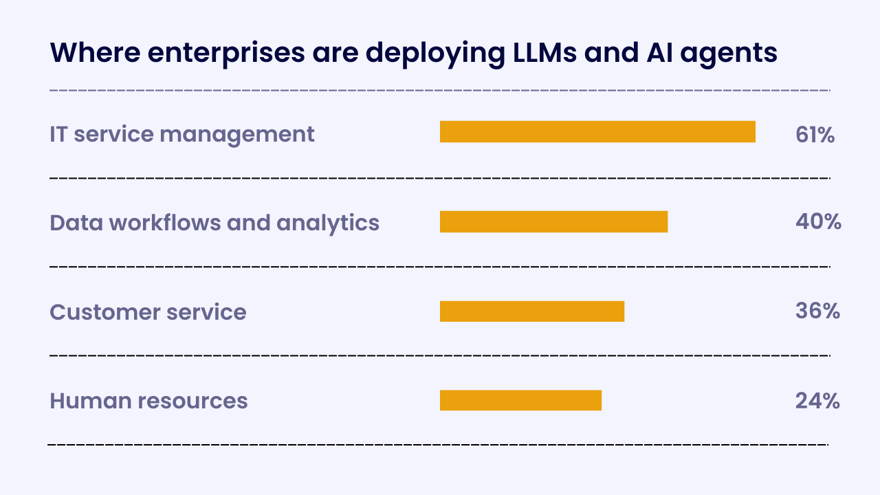 - 61 percent cited IT service management, where ticket classification, triage, and resolution are well-bounded starting points.40 percent pointed to data workflows such as processing and analytics, where cleaning, categorization, and reporting consume large amounts of manual effort.